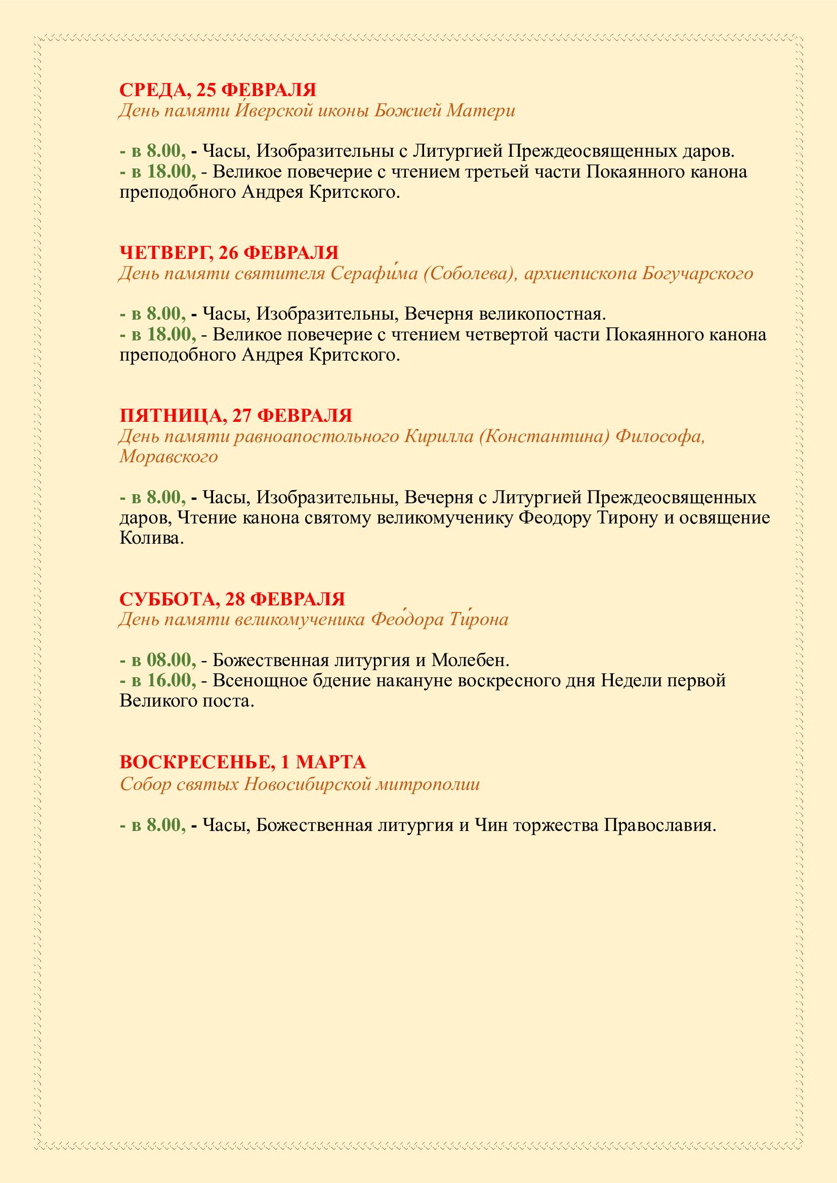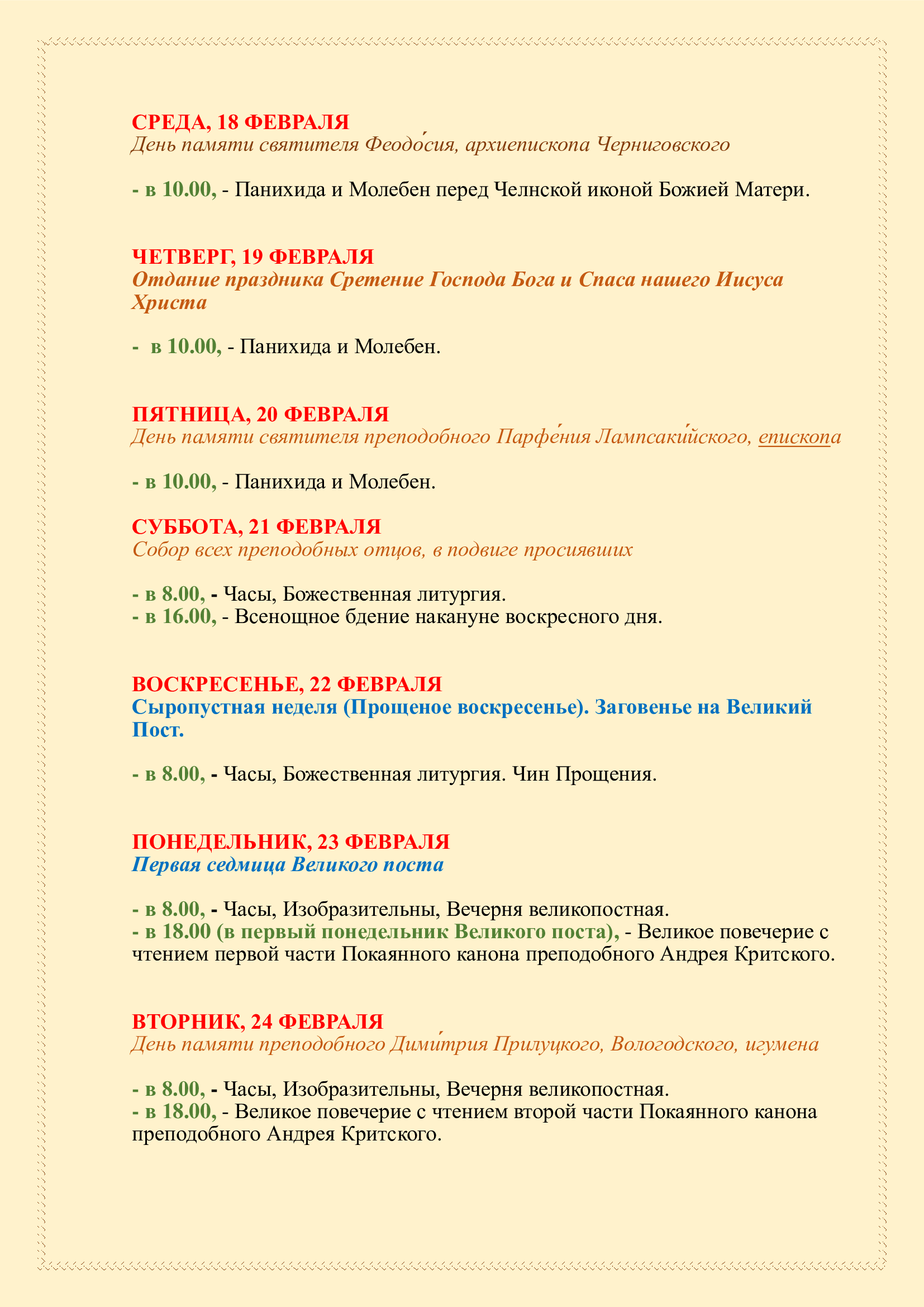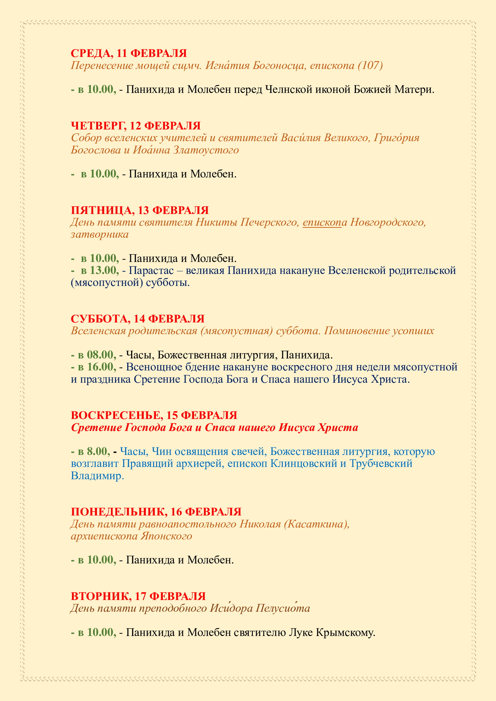 Расписание Богослужений в Сретенском храме (0+)